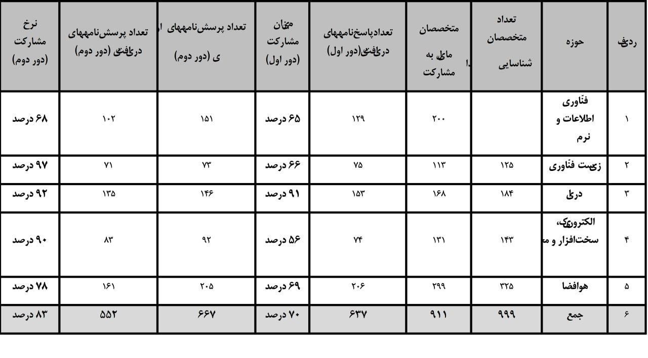 در بین این ۵ حوزه، بیشترین نرخ مشارکت در دور دوم دلفی را متخصصان حوزه زیست‌فناوری (۹۷درصد) داشته و کمترین نرخ مشارکت را متخصصان حوزه فناوری اطلاعات و نرم‌افزار (۶۸ درصد) داشته‌اند.